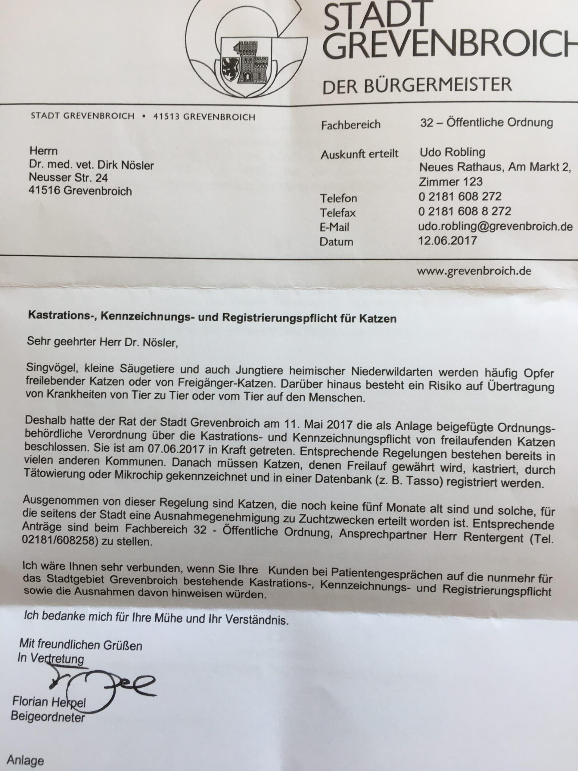 Ich möchte Sie darauf aufmerksam machen, dass die Stadt Grevenbroich eine Kastrations-, Kennzeichnungs- und Registrierungspflicht für freilaufende Katzen beschlossen hat